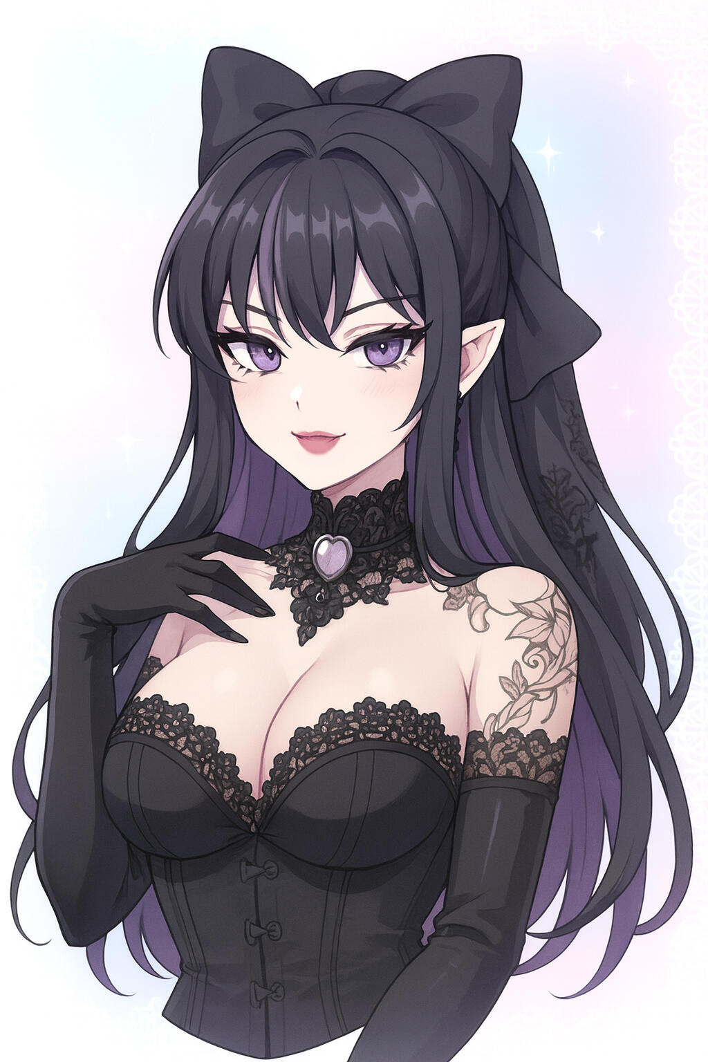 hair color. Jet-black dipped in wine — glossy and wicked, often tousled by hands that shouldn’t have touched her- Highlighted by a lovely light violet streaks.