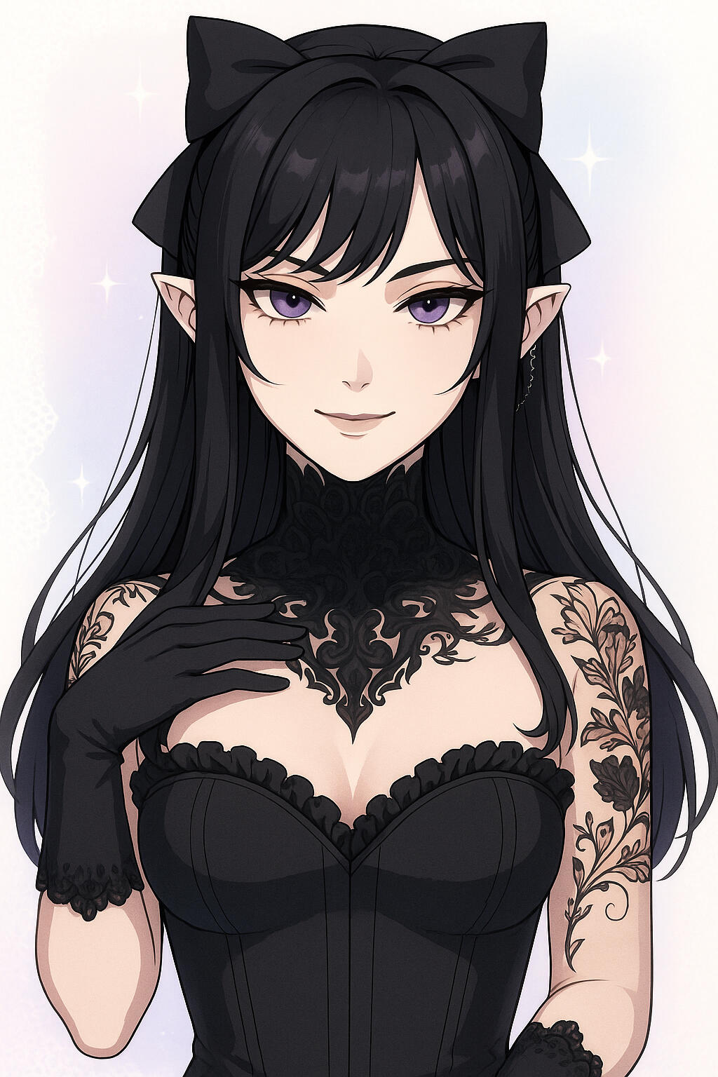 Her skin is unmarred—flawless in that unnatural way that unsettles even the most vain of immortals. Smooth as polished marble, soft as ashfall silk. Encircling her neck and shoulders coils a black ink tattoo, ancient in design—a ring of thorned geometry and cryptic runes said to predate even the first noble houses. It hums with dormant power, and pulses faintly when she feeds.